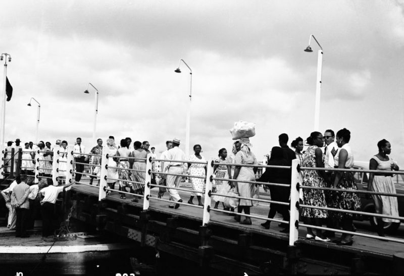 Foto boven: pluriforme samenleving geïllustreerd met mensen op de Emmabrug in september 1958. Nationaal Archief Curaçao, collectie Fischer.
